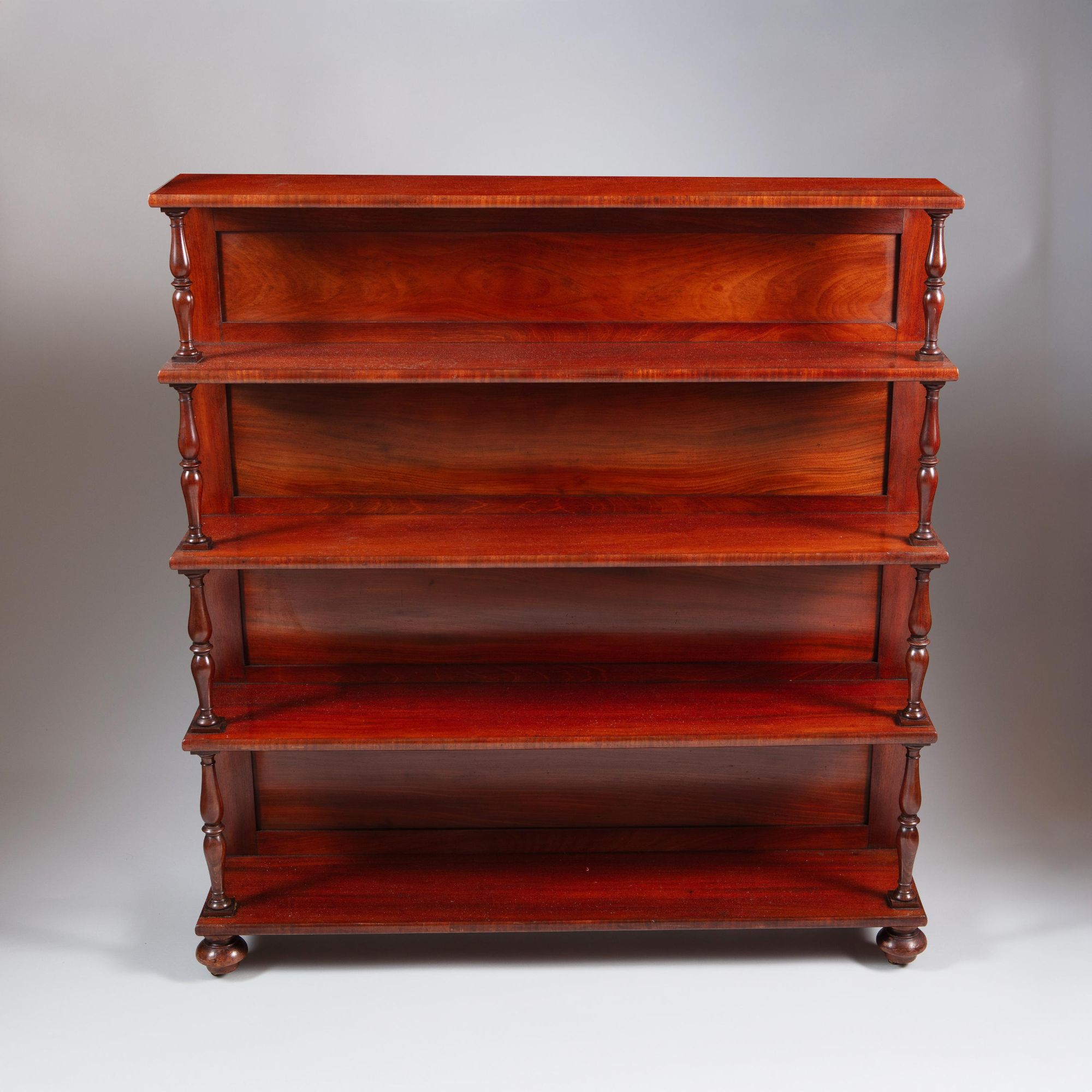 A Regency period mahogany five tier bookcase.of graduated form, each tier supported by turned columns and with a panelled back, on the reverse with a stencilled inscription, 'From FREEMANS/MANUFACTORY/St. ANDREWS NORWICH'.