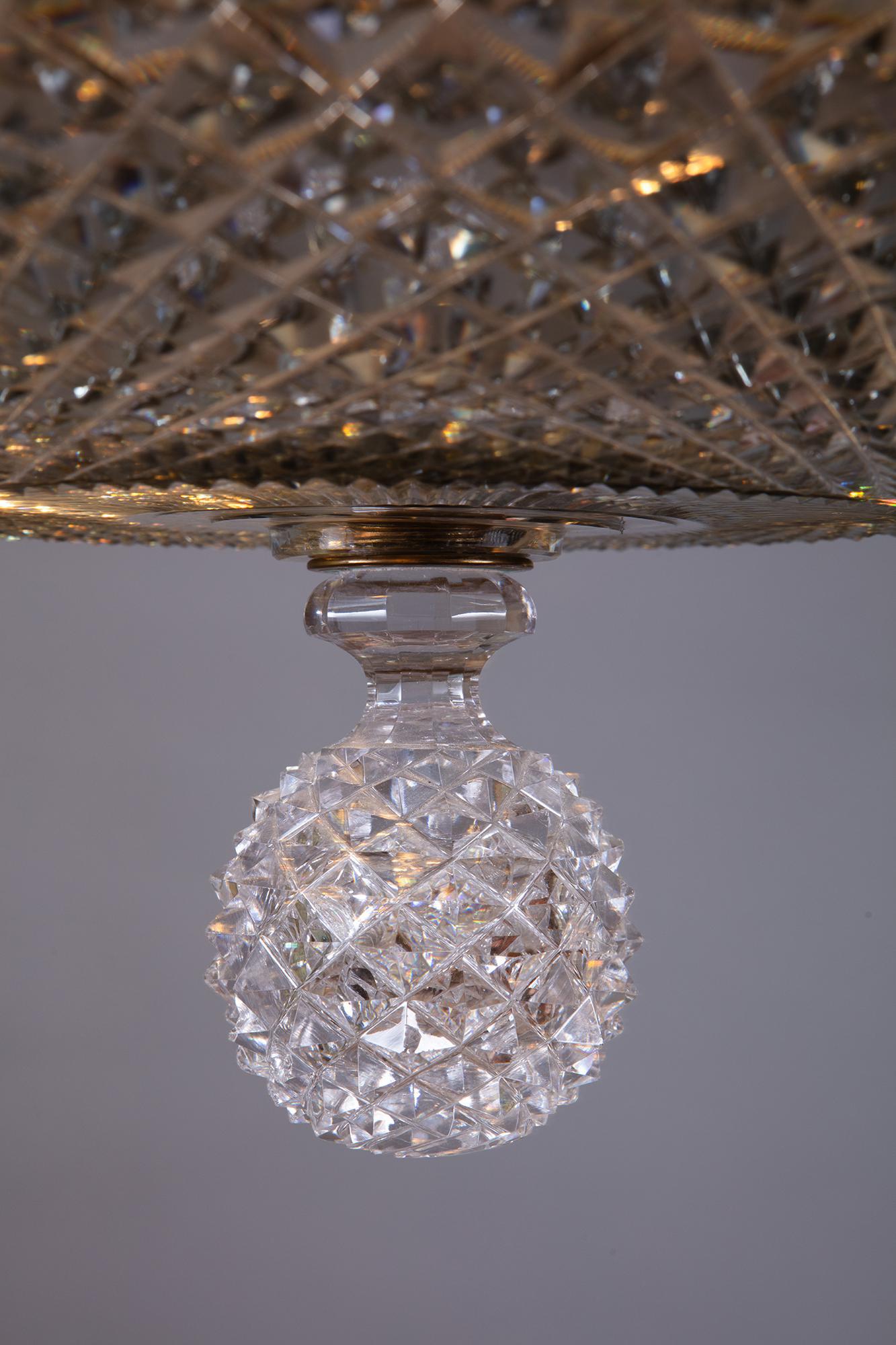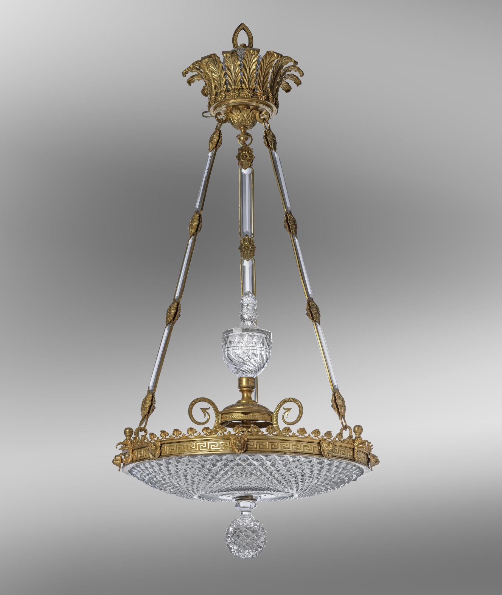 A fine Regency period ormolu and cut glass dish light, the dish cut with concentric bands of lozenges in an ormolu frame decorated with a band of Greek key pattern punctuated by lion's heads and with running foliage above, supported by three eagle-headed scrolling serpents around a central glass urn and ball finial, suspended from three gilt metal and glass chains and a stiff leaf and flower head corona, with a glass orb and ceiling rose.
