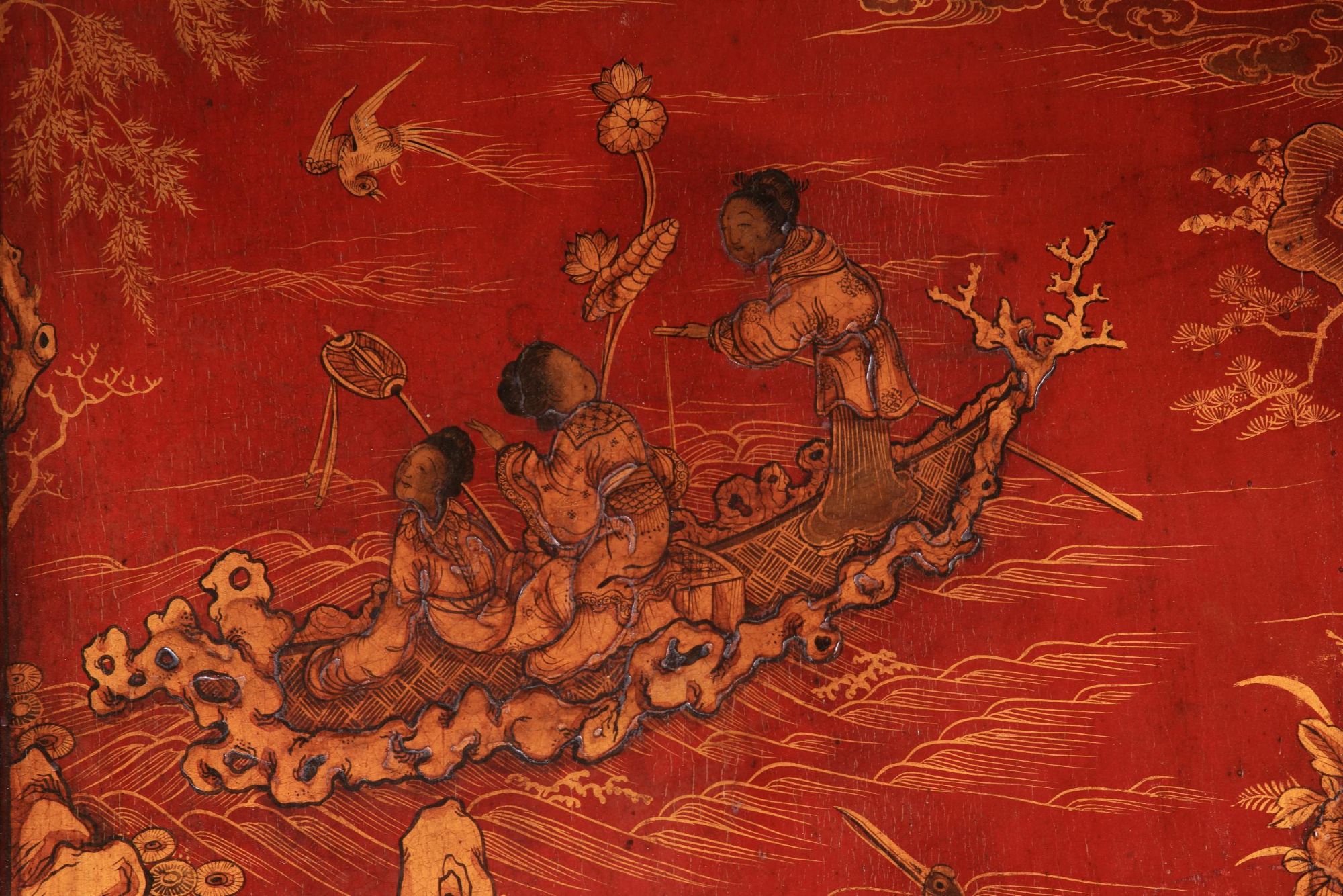A fine pair of early 19th century Chinese lacquer panels, profusely decorated with gilt chinoiseries on a deep scarlet background, depicting Chinese courtiers in landscape settings amongst lakes, pavilions and mountains with storks, boats and and blossoming trees.