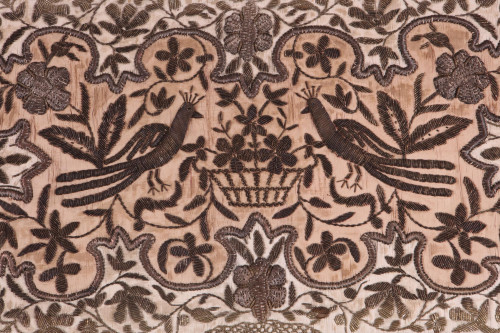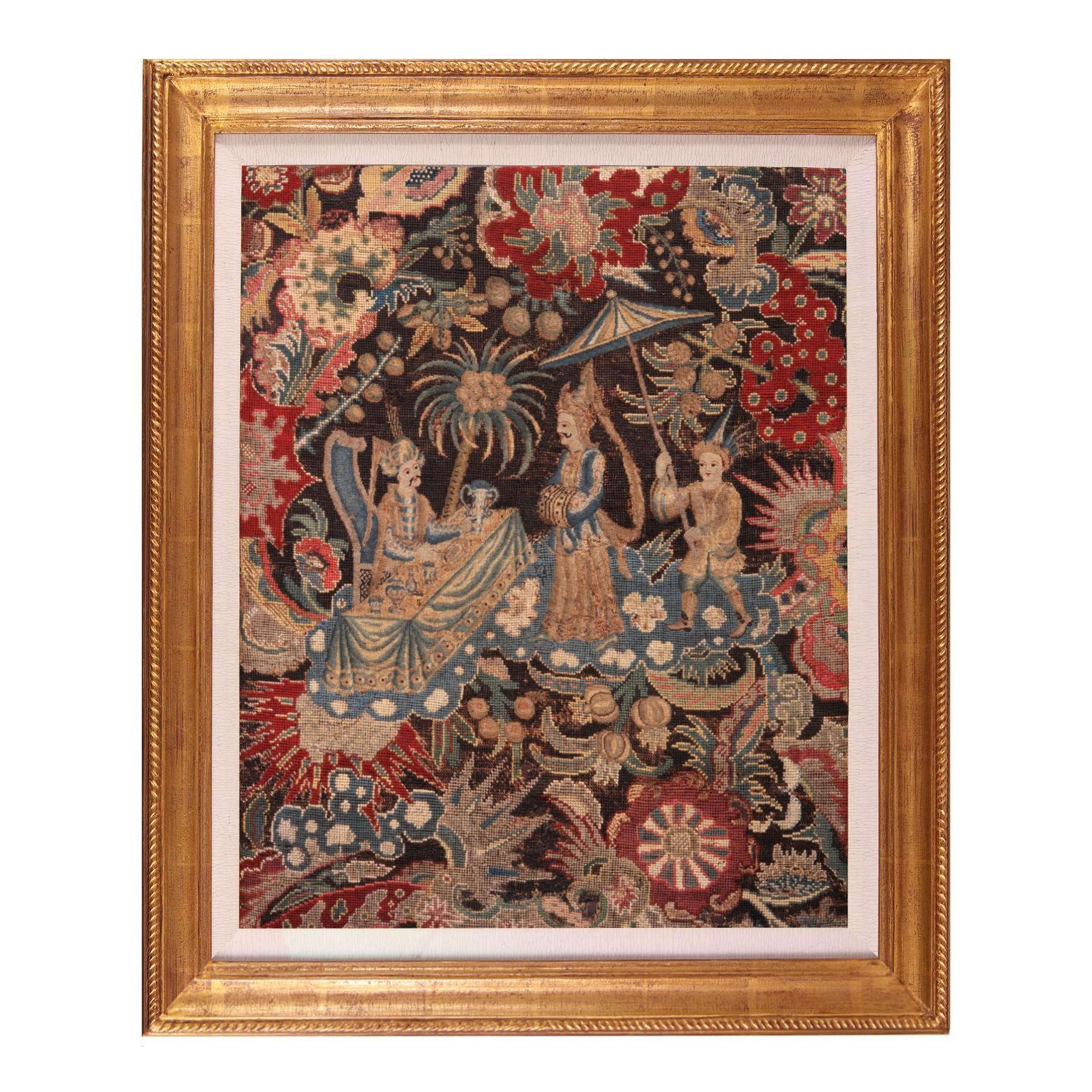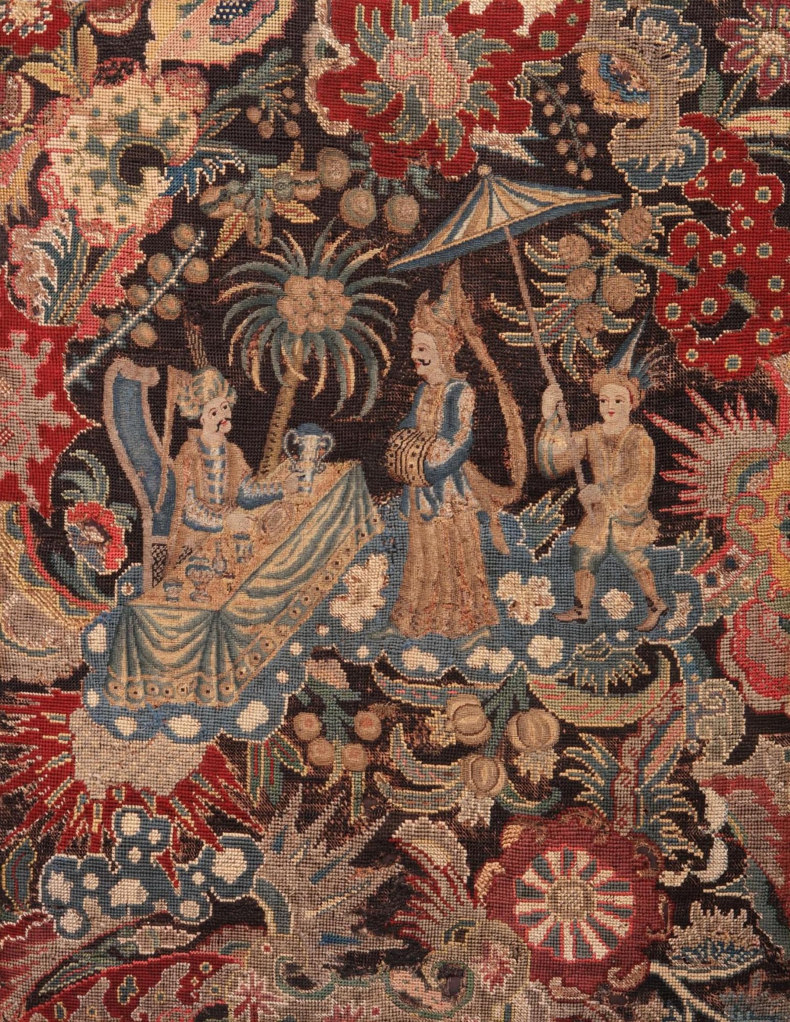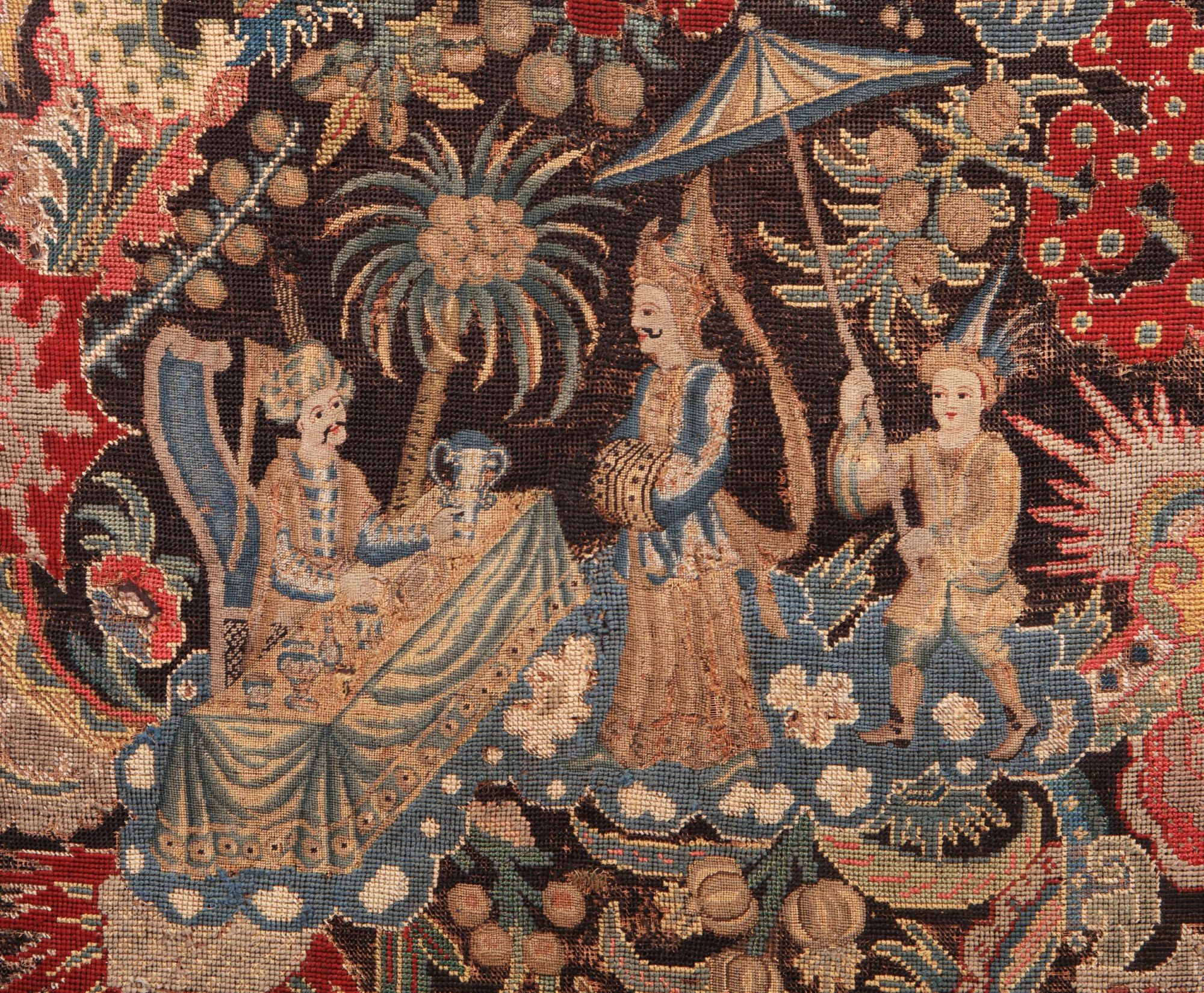 An early 18th century French bizarre style needlework picture 'after the Indian manner', depicting two Viziers, one seated at a lavish table setting, the other with accompanying attendant holding a sun parasol, surrounded by many assymetrical patterns in bright colours against a dark ground, all finely worked in wool and silk.