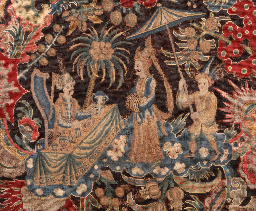 Embroidered designs of this complexity, worked with a mix of styles of three-dimensional bullion, were undertaken by professional workshops. The highly-skilled embroiderers had served long apprenticeships and carefully guarded their techniques. Known as 'Zardozi' work, a Persian term literally meaning 'gold embroidery', it became popular with the European market having become fashionable in Indian textiles and dress. Silver and gold metal 'thread' embroidery consisted of the finest wire or wrapped silk, known as 'sewing gold' made into springy 'purl', threads and wire forming a tube or 'couching', threads woven over a padding material, to create an elaborate three-dimensional effect.